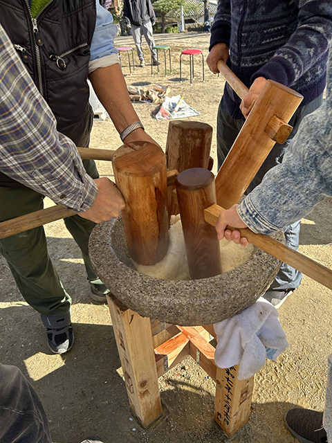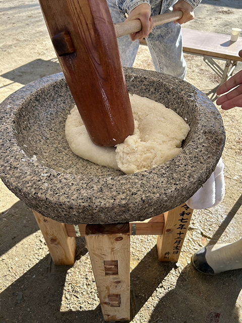 蒸し上がった米を臼に入れ、杵でもち米を潰してこねます。